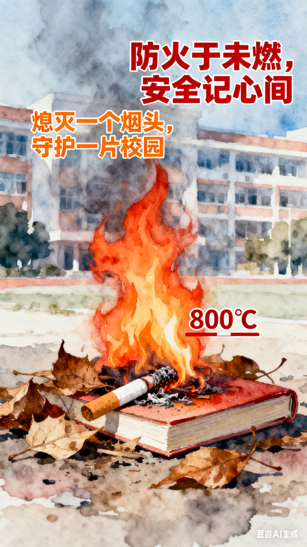 ②污染环境:烟头乱扔、烟雾弥漫,不仅影响校园美观,更埋下火灾隐患。一个未熄灭的烟头,温度高达800℃,足以点燃纸张、落叶,引发火灾。