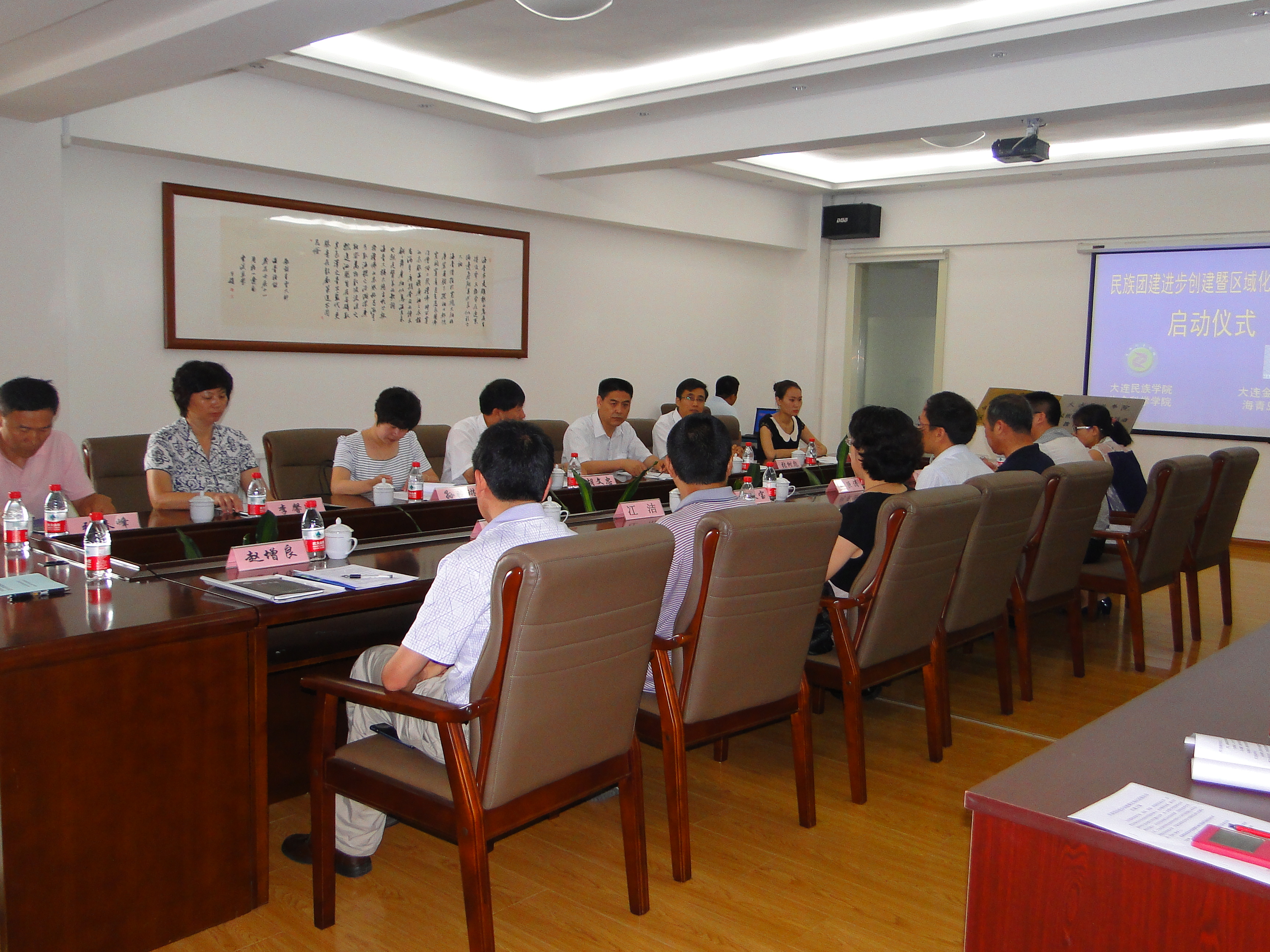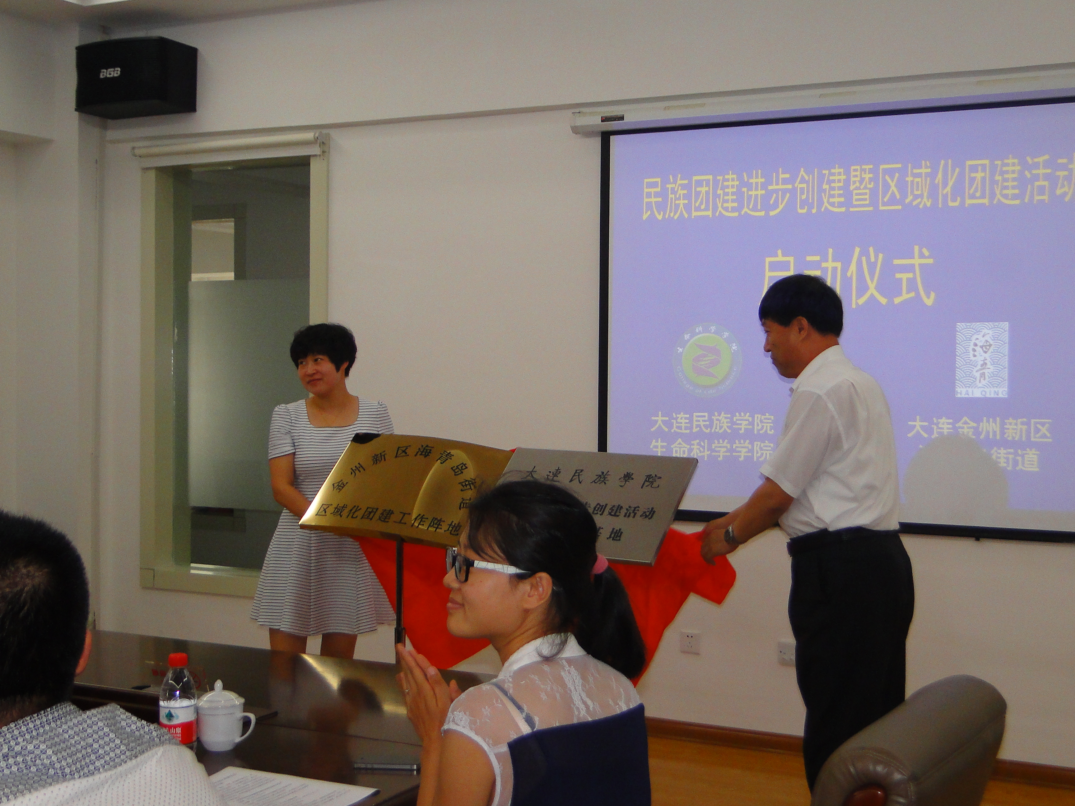 生命科学学院总支书记张树彪宣读了《民族团结进步创建暨区域化团建活动实施方案》,海青岛街道党工委副书记李馨娜宣读了《大连民族学院与金州新区海青岛街道开展民族团结进步创建暨区域化团建活动协议书》。院长胡文忠和海青岛街道人大工委主任胡俊代表双方签署《民族团结进步创建暨区域化团建活动协议书》,并为民族团结进步创建活动教育实践基地和区域化团建工作阵地揭牌。