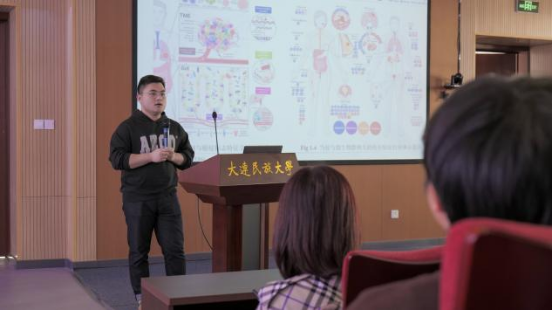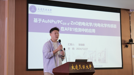 在科研成果汇报中,马浩迪同学做了题为“刺激相应型纳米硒药物递送系统的构建及抗肿瘤活性研究”的汇报,展示了学院新购置小动物活体光学成像系统的应用情况,这一设备能够直观地看到药物在小鼠体内的分布和作用过程,这为药物研究和开发提供了新的研究手段;张珈旗同学的“基于AuNPs/PCZIF-8-ZnO的电化学/光电化学传感器在AFB1检测中的应用”报告,讲述了一种在检测AFB1方面表现出色的传感器技术;姜亚枫同学通过“双功能MOF封装钴掺杂碳点纳米酶驱动的AFB1化学发光/荧光双模式检测”,展示了如何利用纳米酶的特性来实现对食品中常见毒素AFB1的快速、准确检测;信雨林同学介绍了“玉米根系简化细菌群落的定量与其生物防治效果的评价方法”,通过深入研究玉米根系的微生物群落,提出了一种新的定量方法,并探讨了这些微生物群落对农作物病害的生物防治效果;张座铭同学讲解了“一种用于肿瘤检测的NIR-II荧光检测技术”的原理和优势,并通过一系列实验结果展示了其在肿瘤早期诊断中的巨大潜力。
