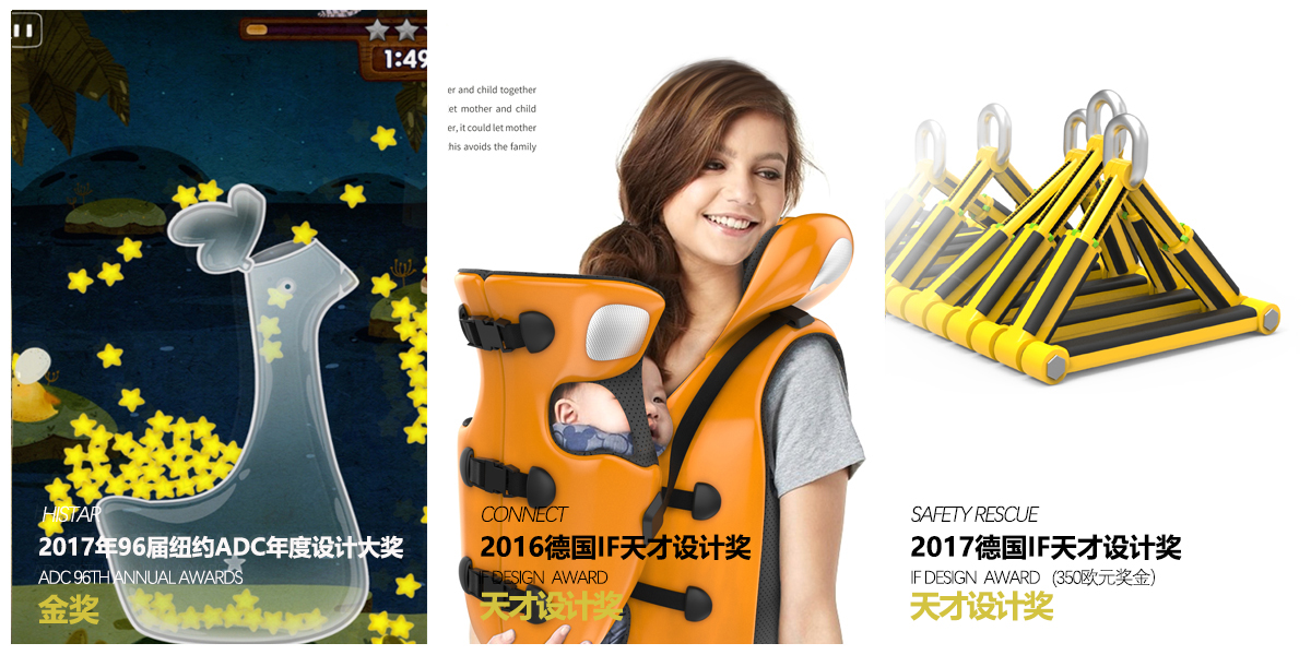 累计获得83项德国红点概念大奖(包括:8项Best of the Best最佳设计奖),220项美国IDEA设计奖(包括:2项金奖、3项银奖、12项铜奖、203项Finalists), 100项德国iF概念奖、天才设计奖、新秀奖(包括:11项年度大奖、40项Best),13项中国红星原创大奖(包括:1项原创银奖、1项未来之星大奖)在内的416项国际、国内顶级设计奖