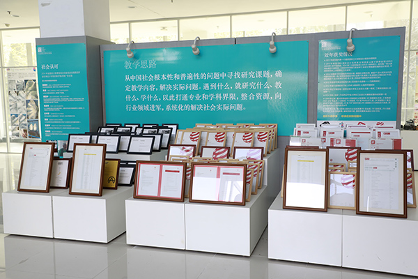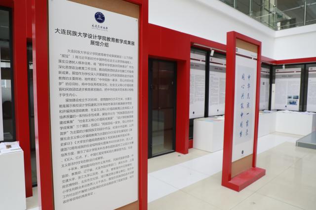 设计学院教育教学成果展馆成立于2009年,使用面积605平方米,分为三个展区。其中,“设计学院教育教学成果展”展区,主要展示设计学院建院以来始终秉承的教育教学思路、创新人才培养模式成果、教师科研成绩以及研究成果转化等;“社会主义核心价值观成果展”展区,依托价值观教育相关课程,主要展示了2000余名学生撰写的《家史家训》、《大学生价值观调查报告》、《社会结构变化图表》;“民族团结进步创建成果展”展区,以“民族团结一家亲,同心共筑中国梦”为主题,集中展示了王宁老师“全国民族团结进步模范个人”的奖章设计,金青松老师国家民委网站的LOGO设计、少数民族文创设计以及纪录片等作品。展馆成立十年来,逐渐具备了宣传、平台、教育、文化四大功能,建有完善的制度管理、活动管理、设施管理、档案管理流程,配备专兼职师生讲解员10人,面向校内外义务开放,每年接待政府、高校、企事业单位、地方中小学生和群众百余次。