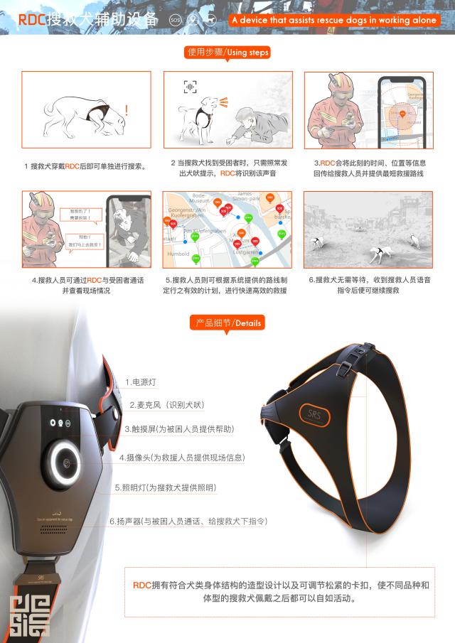 本届大赛于2018年12月启动,共收到来自国内外报名作品6508件,其中,产品组作品汇集了长虹、格力、小天鹅等国内知名企业的最新产品,创意组作品吸引了清华大学美术学院、中央美院、鲁迅美术学院、江南大学等多所知名高校的优秀学子、国内外优秀设计师们的踊跃参与。bat365作品“RDC搜救犬辅助设备”以最高分的成绩从创意组作品中脱颖而出,与格力等三组产品组参赛企业同台竞争,获得评委的一致肯定,最终获得大奖。“RDC搜救犬辅助设备”是一款提高灾后搜救效率的搜救犬可穿戴设备,在执行搜救任务时,搜救犬穿戴设备后可以独自进行搜索,当搜救犬发现受困者时发出犬吠,RDC辅助设备将把时间、位置等信息发送到搜救人员设备上并提供快速救援路线,搜救人员可与受困者建立联系,方便制定搜救计划,对现场的情况作出预估和准备,实行快速高效的救援。此作品正在专利申请中,一旦投入使用,将为救灾现场提供极大助力。