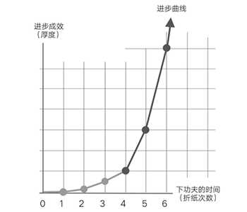 右边的图是A4纸对折数次的曲线图,第一次对折是2层,第二次是4层,第三次是8层,随后16、32、64、128、256......是按指数关系增厚。一个人学习的进步状况与这条曲线很相似。