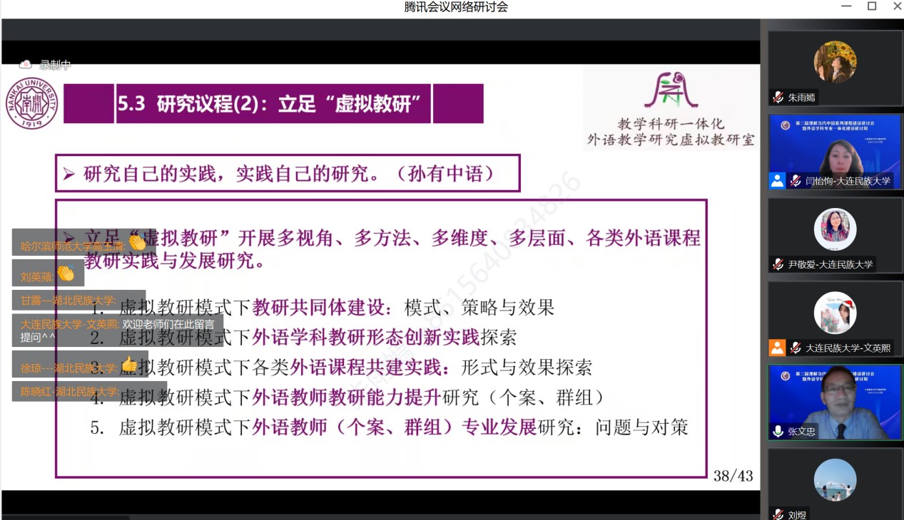 本次会议与会者100余人,张文忠教授发言后,来自东北三省一区东北师范大学、哈尔滨师范大学、大连外国语大学、内蒙古民族大学、渤海大学、湖北民族大学、沈阳师范大学、沈阳药科大学、bat365中文官方网站、鞍山师范学院等十多个院校的专家、教授、老师们,对外语学科专业建设、国际传播能力建设、理解当代中国系列课程与教材建设等进行了充分的交流与讨论。闫怡恂教授代表参会教师对报告内容进行提问,张文忠教授在回答提问过程中,进一步对虚拟教研室项目的申报准备进行解释。张文忠教授提到,各个省份高校可以从校级开始自我建设,联合全国高校教师,形成规模,为省级教研室申报做好准备。例如湖北师范大学的成功。