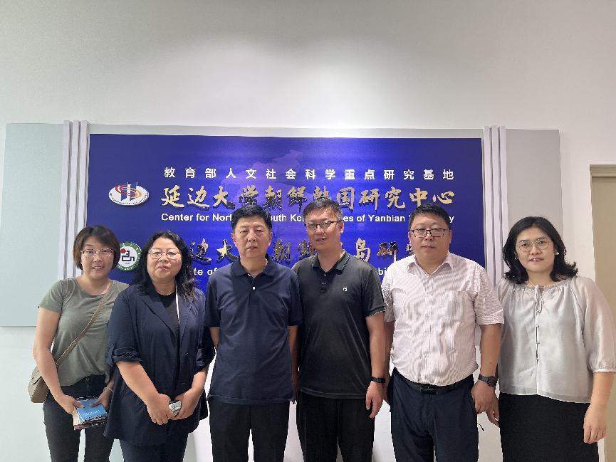 随后,刘煜书记、教学副院长尹敬爱和朝鲜语系系主任陈楠楠访问了教育部人文社会科学重点研究基地延边大学朝鲜韩国研究中心和延边大学朝鲜半岛研究院。中心主任、研究院院长朴灿奎会见了刘煜一行,中心副主任谭轶操,比较文学与文化研究所所长崔香丹参加座谈。朴灿奎主任对朝鲜韩国研究中心的基本情况和研究特色进行介绍,双方与会人员就人才培养、社会服务、学术交流与合作以及高水平平台建设等进行了深入交流。