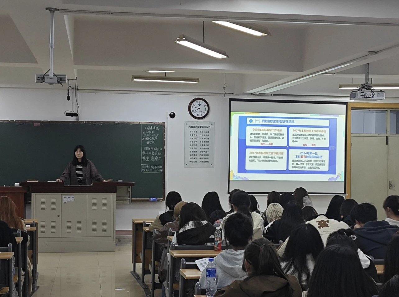 辅导员老师则根据不同年级学生的特点,分别提出具体的要求。她们强调,提高思想认识是首要任务,要求学生们充分认识到审核评估对个人和学校发展的重要性,呼吁大家共同营造良好的学习氛围,鼓励学生在学习上互相帮助、共同进步。此外,辅导员老师还强调了遵守各项规章制度的重要性,希望每位学生都能够自觉维护校园秩序,树立良好的个人形象。最后,创建文明寝室也是评估工作的一部分,她们鼓励学生在日常生活中注重文明礼仪,营造和谐的生活环境。