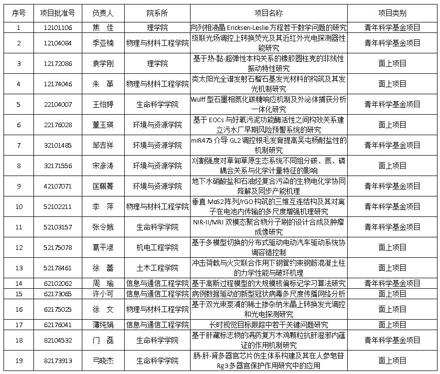 日前,国家自然科学基金委公布了2021年度国家自然科学基金项目评审结果,bat365共获批19项,资助直接经费合计802万元。其中,面上项目10项、青年科学基金项目9项。各学院获批情况为:物理与材料工程学院4项,环境与资源学院4项,生命科学学院4项,信息与通信工程学院3项,理学院、预科教育学院2项,土木工程学院1项,机电工程学院1项。