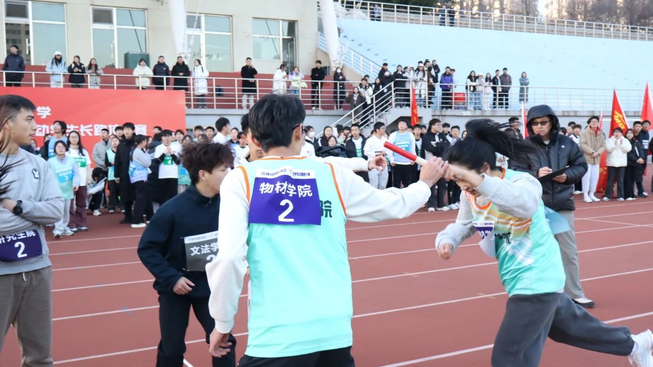 在长跑接力赛中,每一位参与者都竭力而为,挑战极限。尽管寒冷的天气和漫长的距离考验着体力,但同学们坚持跑完每一步,体现了物材学子顽强的毅力和拼搏精神。同样的,在长跑的路上,我们也见证了许多同学互相鼓励、相互扶持的场景。正如物材学院一贯的精神:我们不仅注重知识的积累,更注重集体的力量和协作的精神。在这条“跑道”上,大家同心协力,携手并肩,用汗水和坚持诠释着“团结奋进”的价值。