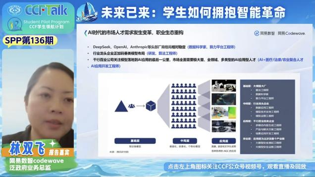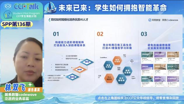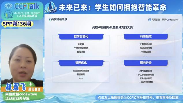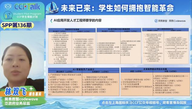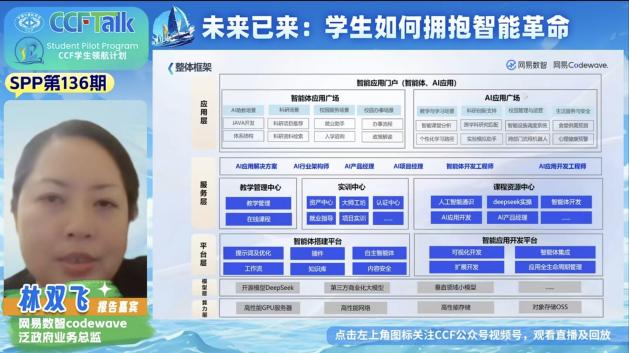 直播开始时,主持人信息与通信工程学院研究生付桐烜简单介绍了本期SPP活动以及分享嘉宾林双飞老师。林老师现任网易数智codewave泛政府业务总监,先后在戴尔、微软等跨国科技企业与网易头部互联网公司深耕信息技术行业18年,担当“商业化落地”核心角色,专注云计算、人工智能技术与产业场景深度融合,积累从技术架构设计到跨行业解决方案落地全链条经验。
