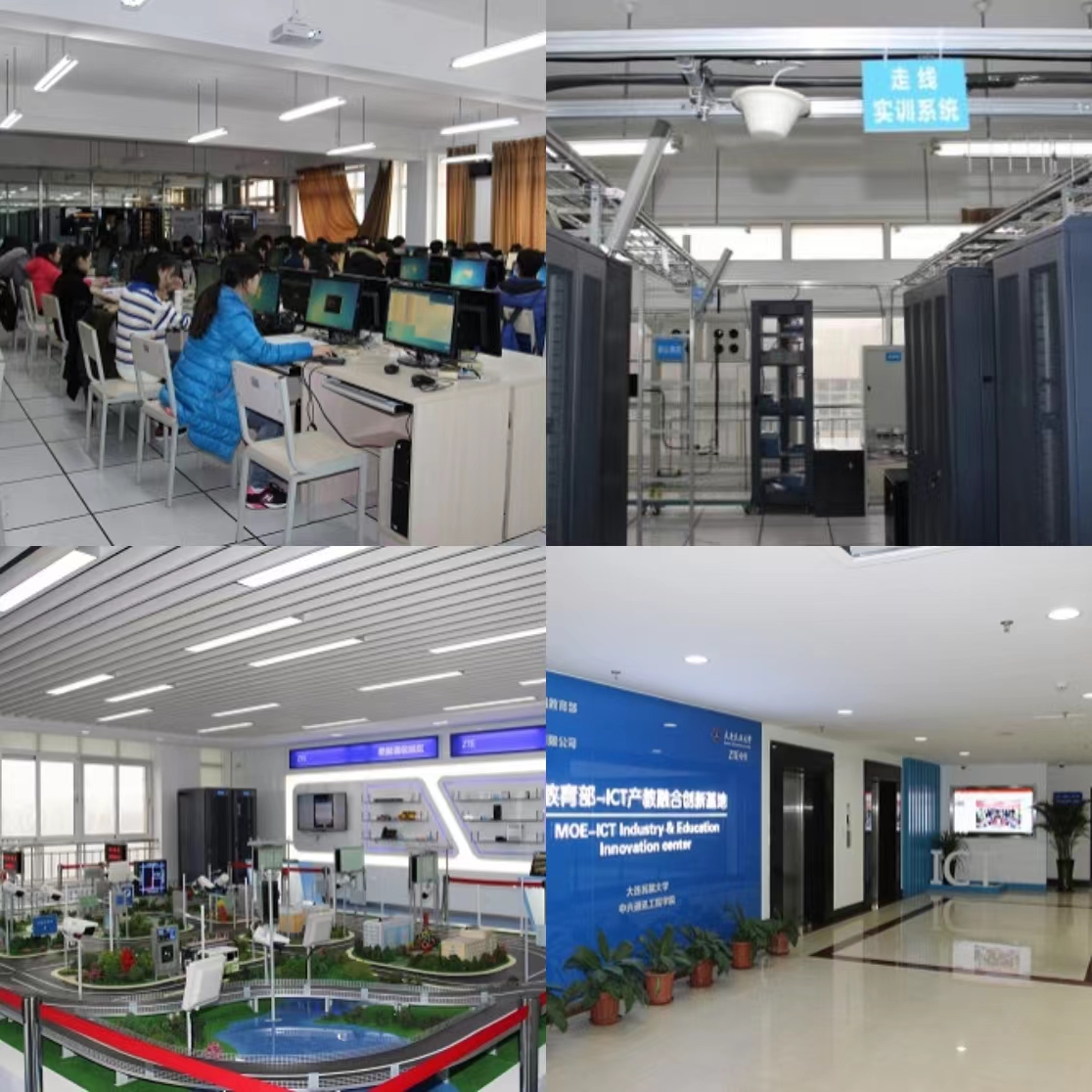 ICT产教融合创新基地以云、管、端的模式建立实验环境,将先进的信息技术、数据通讯技术、移动通信技术、电子传感技术、控制技术及计算机技术等有效地集成运用于实践教学。ICT产教融合创新基地建设了包含移动通信实践平台、光通信实践平台、数据通信实践平台、云计算实践平台、智慧交通实践平台等5个实践实训平台,面积800余平方米。