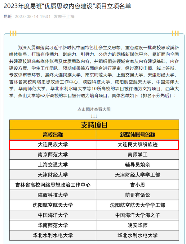 近日,教育部易班发展中心公布2023年度易班“优质思政内容建设”支持项目立项结果,bat365“大连民大缤纷族迹”新媒体公众号获批支持项目,全国仅10项。