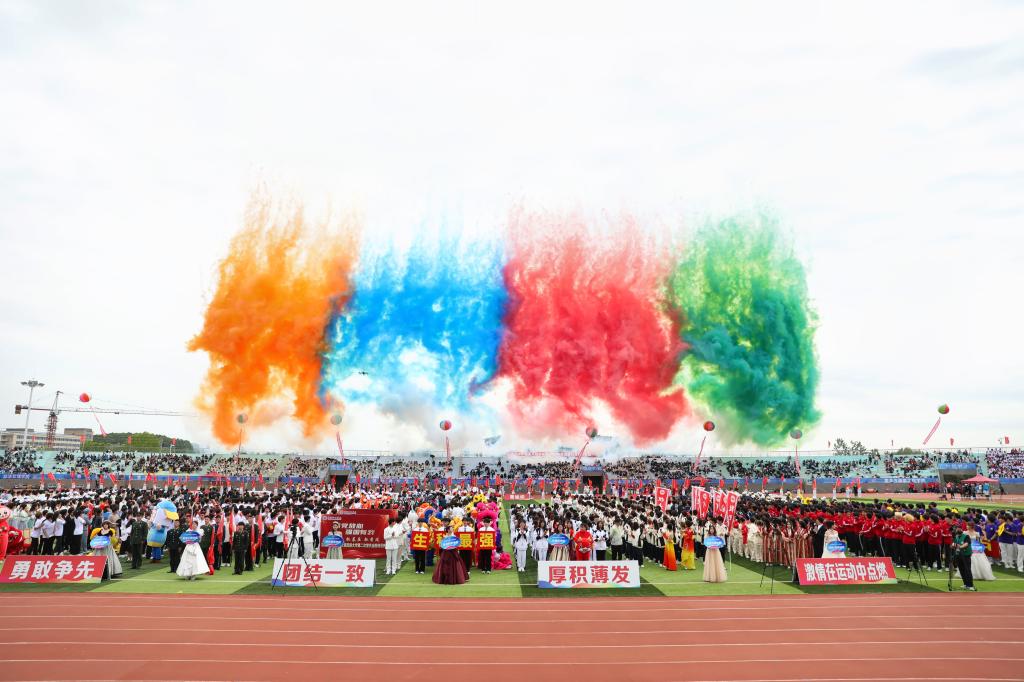 在激昂的音乐声中,彩烟腾空而起,体育与音乐碰撞出朝气蓬勃的火花,现场气氛热烈欢腾,掌声、欢呼声经久不息。