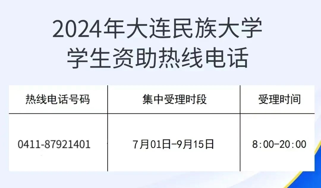今年暑期,教育部将继续开通高校学生资助热线电话,号码为010—66097980、010—66096590,受理时间为7月1日—9月15日,每天8:00—20:00,为大学新生特别是家庭经济困难的大学新生提供资助政策咨询与帮助。